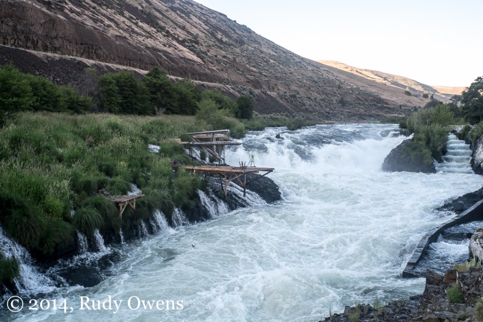 Sherars Falls, 4 ← Previous Platforms erected by tribal fishermen line the Deschutes River, at a spot managed by the Confederated Tribes of Warm Springs (2014). When I visited the first week of June 2014, spring Chinook were running.