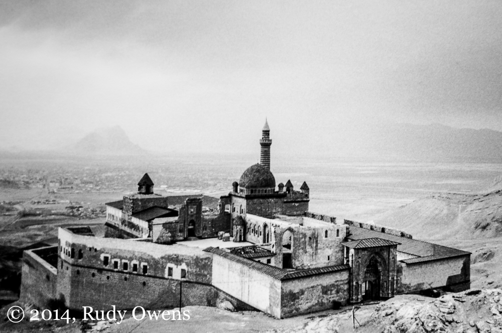 This fortress, on the Silk Road, in northeast Turkey in the border city of Doğubeyazıt, also has a very distinct and Armenian looking structure that likely predates the later fortress, seen to the left of the structure (taken in 2001). Other and more historic ruins are on the hillside, not seen, include an old Urartu complex that predates the Byzantine Empire.