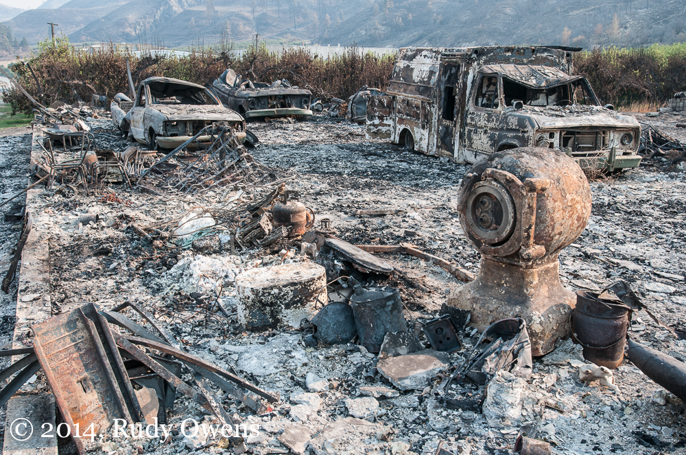 Destruction in the Methow Valley ← Previous Next → One can see some of the dozens of burned structures in the Methow Valley, like this, driving north from Pateros to Twisp.