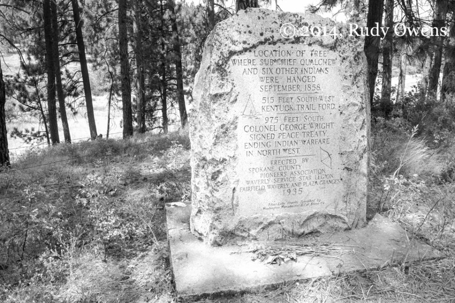 This monument was erected in 1935 by Spokane residents at the location where the warrior Qualchan/Qualchew and six other Indian warriors were hanged by the U.S. Cavalry in 1858. Today it is a tourist attraction for history buffs, which I count myself among.