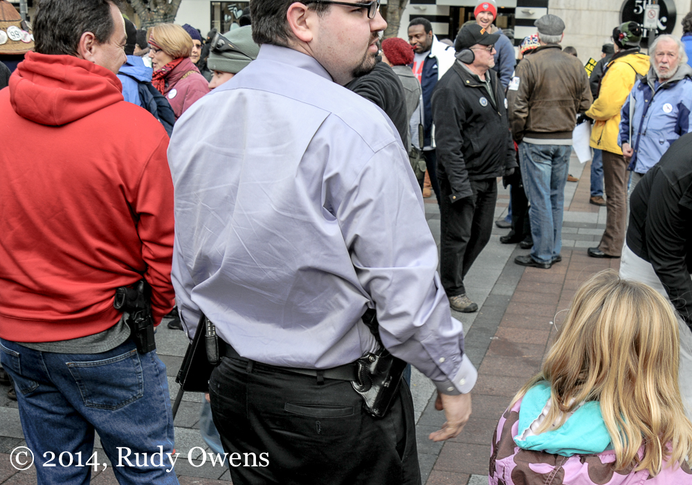 Scene from a Rally Against Firearms Violence I took this photo of a small group of firearms advocates who were counter-protesting a rally to raise awareness of firearms violence in January 2013. I took this photo at one of downtown Seattle’s major public squares.