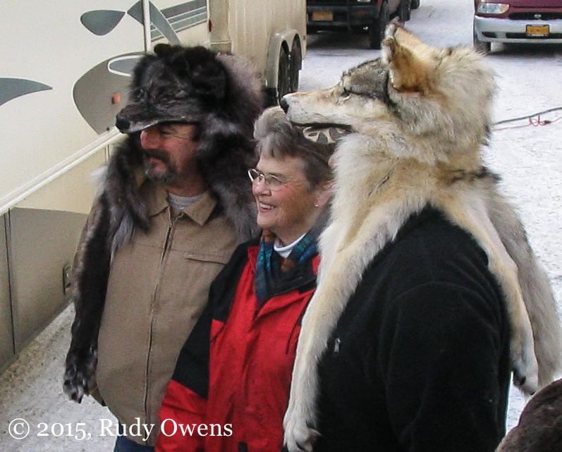 Wolf Hats in Anchorage Next → I shot this photo of two Alaskan men posing with a woman at the ceremonial start of the Iditarod in 2006. Pelts of killed wolves are sold here, and many trappers proudly show off their prizes with this head gear.