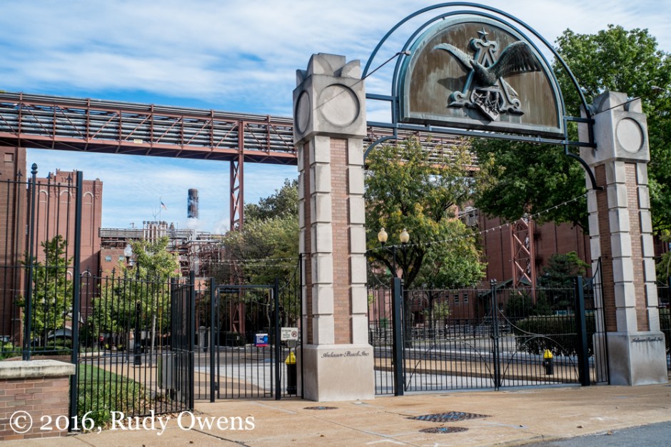 Anheuser Busch Factory Gate Next → The west entrance to the Anheiser Busch factory displays the iconic Germanic eagle moniker of the King of Beers. Anheiser Busch Factory Gate