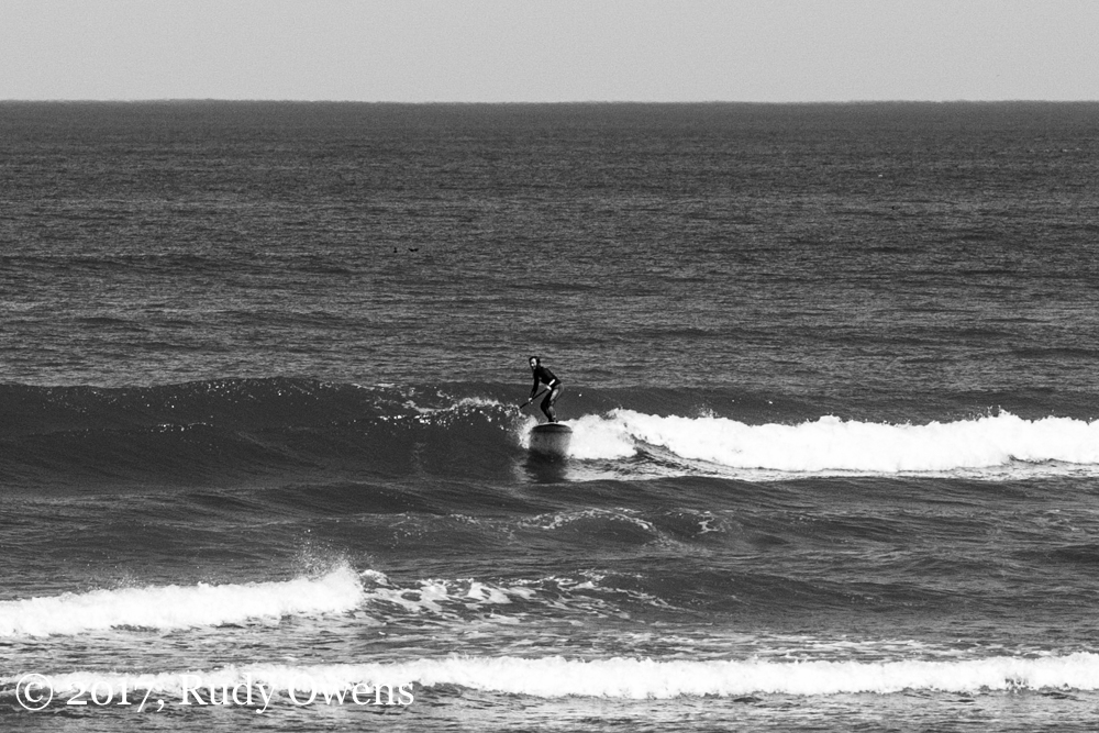 SUP Seaside BW June 2017 ← Previous Next → A standup paddleboard surfer at Seaside in June 2017 catches smaller waves.