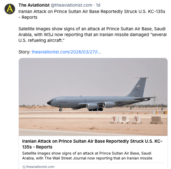 Also in March, reports have emerged of two separate missile strikes on the Saudi Prince Sultan Airbase, in mid-March and again on March 27, 2026. In the first attack reported on March 14, 2026, five large aviation refueling aircraft, KC-135s, were hit or damaged, and possibly three more KC-135 refueling aircraft were destroyed in the second strike at the same base, which injured 12 U.S. service personnel. Again, U.S. media coverage was apparently suppressed by corporate media.