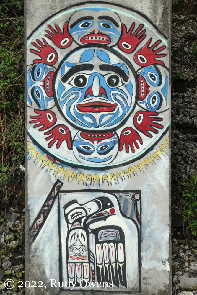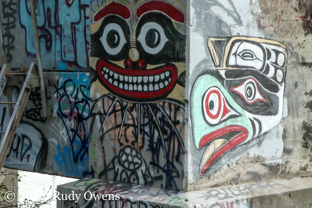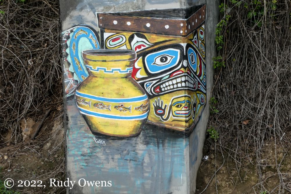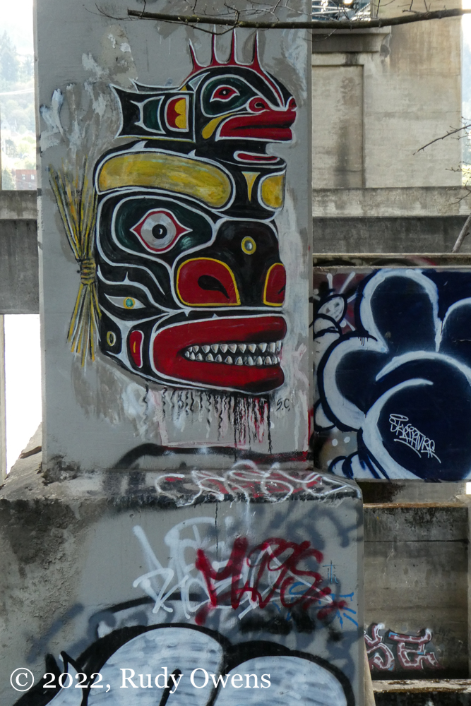 As for these new murals, I like them, aesthetically. They are vital. They adhere to beautiful traditions I have seen first-hand in Southeast Alaska and British Columbia, including in living studios of Native and First Nations artists in those places. These pieces also bring life to an area that is shared by the public. It is a space used all residents for biking, hiking, walking, and other sports, and it is a de facto home to Portland’s large houseless population, who live in the elements a stone’s throw from where you see these pieces. So far, no graffiti artists who tag the concrete and steel spaces in this area have covered these pieces. It appears there is respect by that community too.