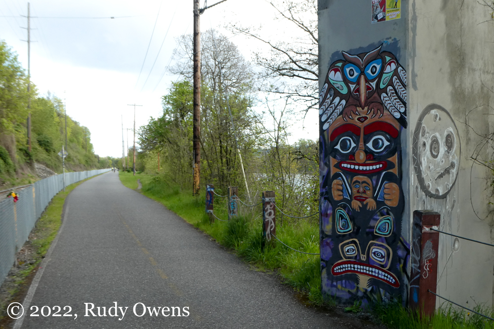 In late winter 2021, trail users on Portland’s Springwater Corridor were suddenly greeted with Northwest, Coastal Salish, and Alaskan Native imagery on utility towers and graffiti-covered surfaces of the Ross Island Bridge.